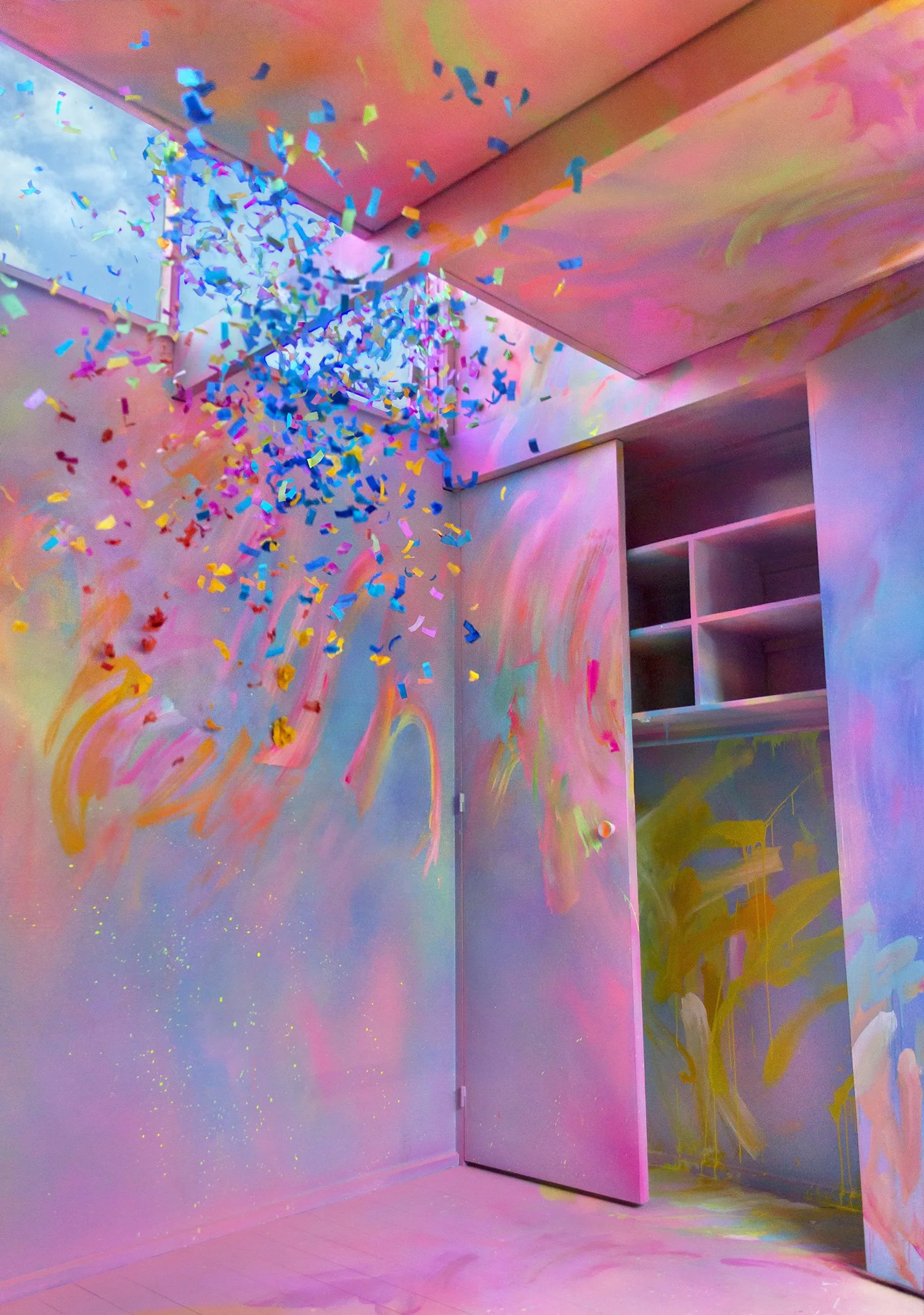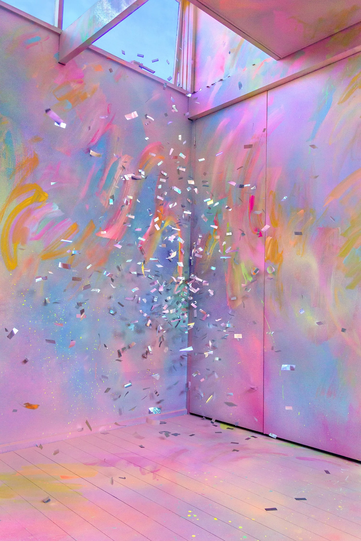 “One of the pretty things I noticed about the paper confetti is that it flutters, floating more gently than the silver foil, almost like – butterflies! Without intentionally planning it, the butterfly-like marks on the walls took bodily form. Filling HEART with gentle colourful movement. I’ve had a special connection to butterflies for years – they’ve featured in my other artwork numerous times. To me they represent the fulfillment of a promise, freedom, lightness, authenticity. So it was emotional to experience the fluttering paper butterflies in HEART. Creating a new atmosphere, one of happiness, authenticity and rebirth, after so long in chrysalis form.