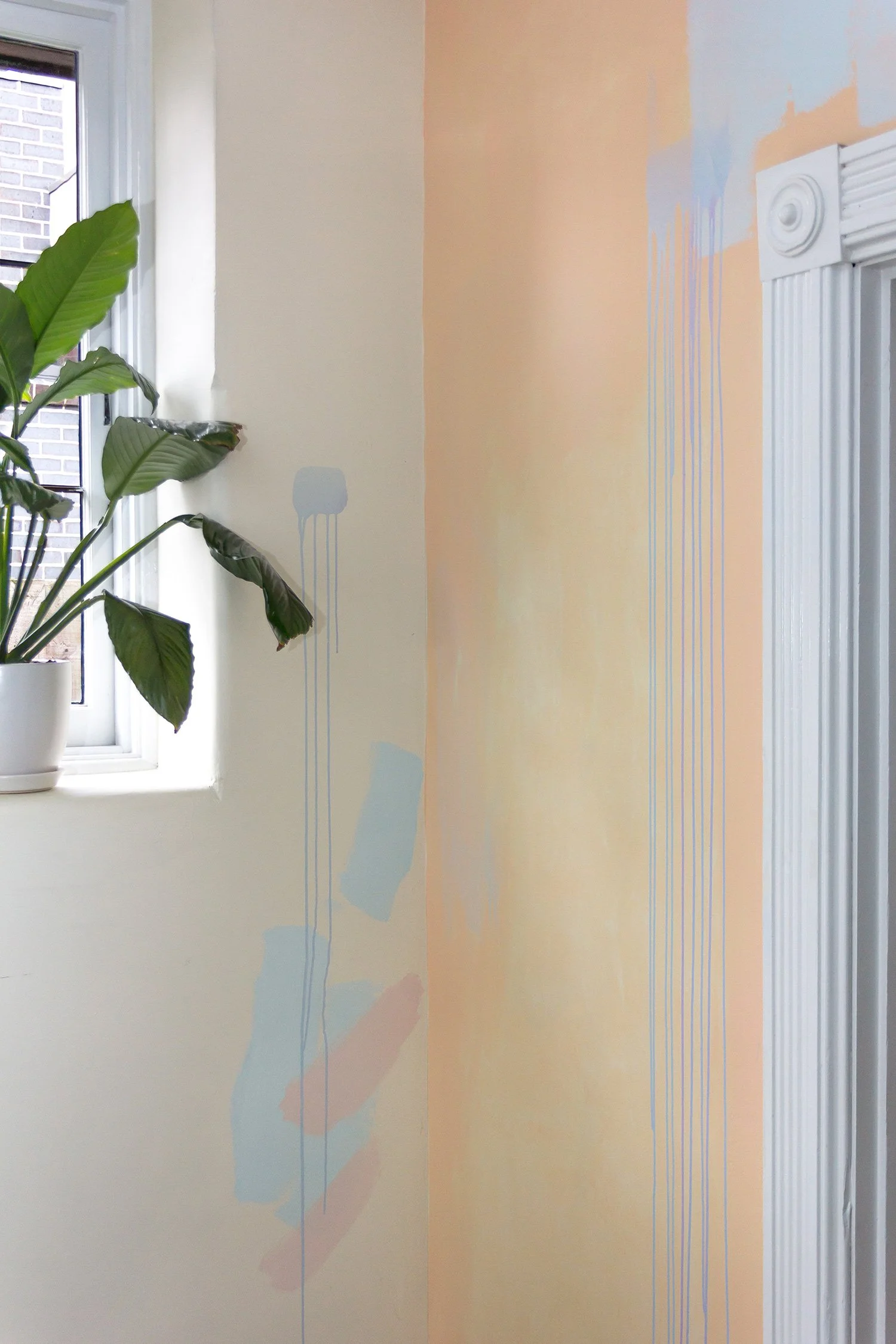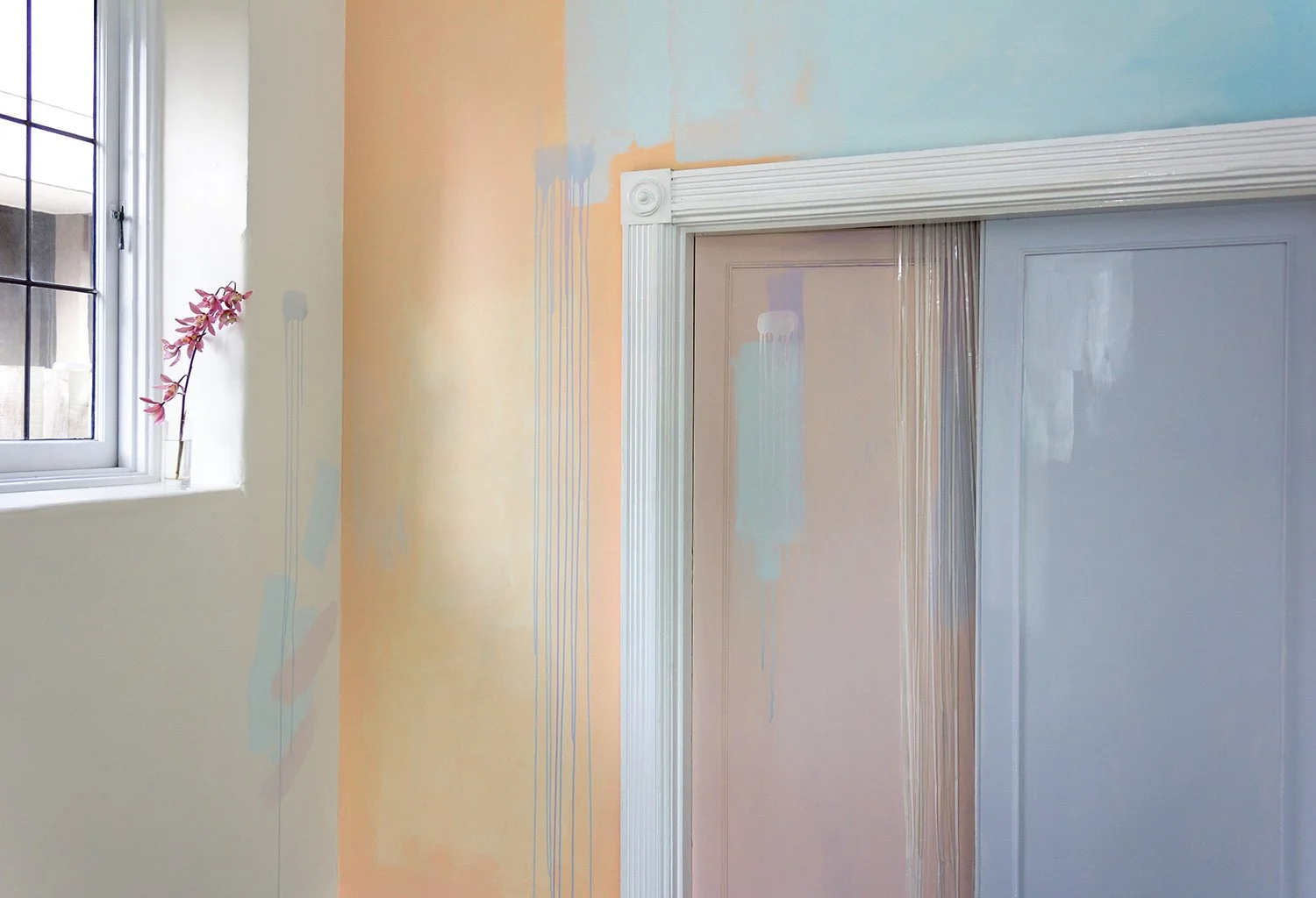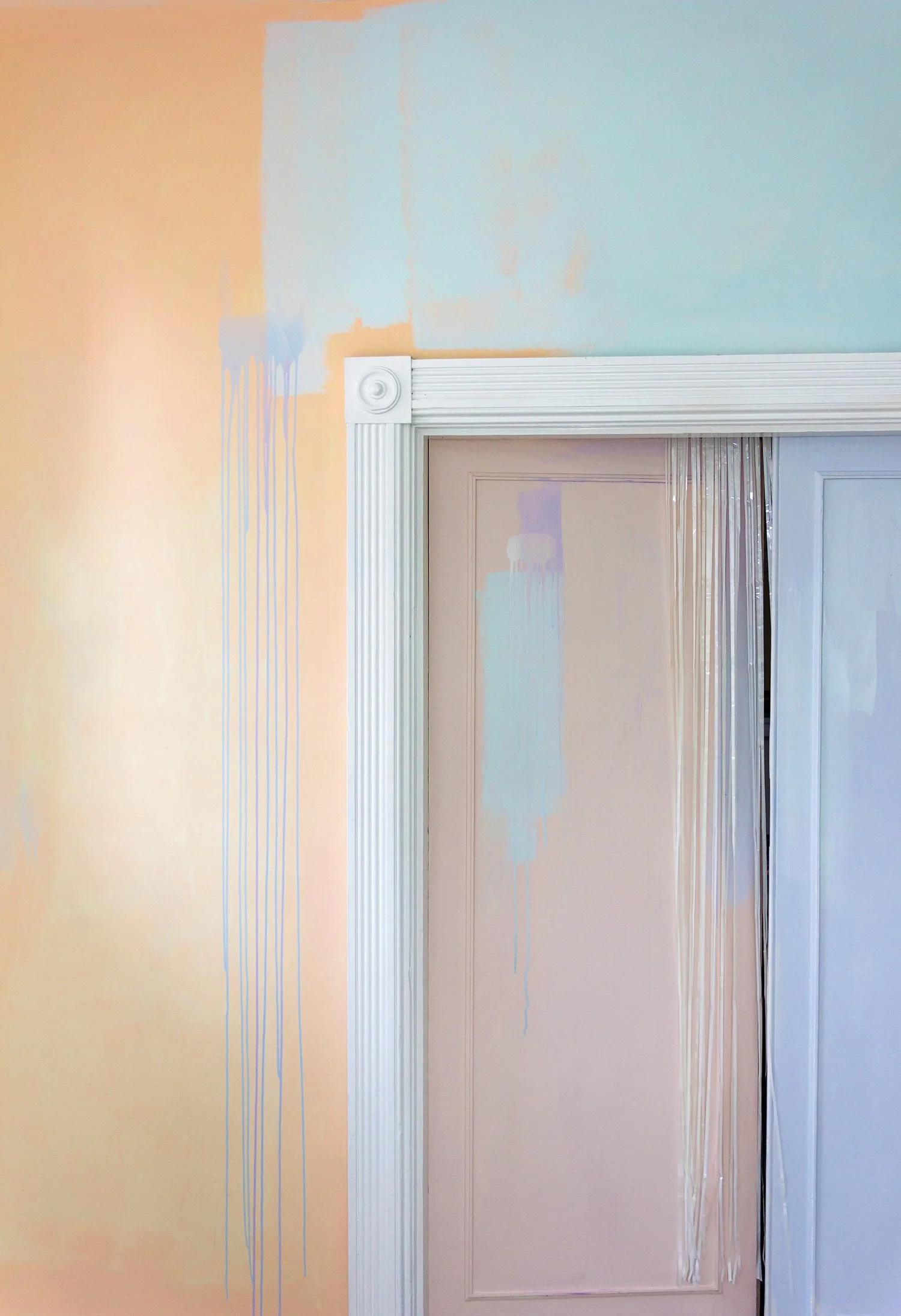 A door opens to a pastel painted room, the paint drips down the walls.