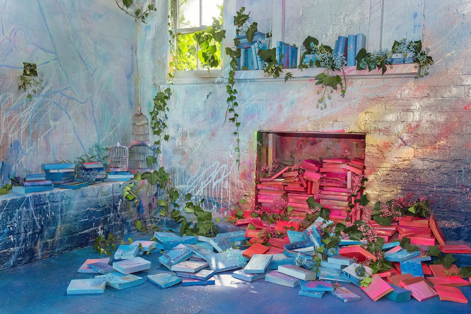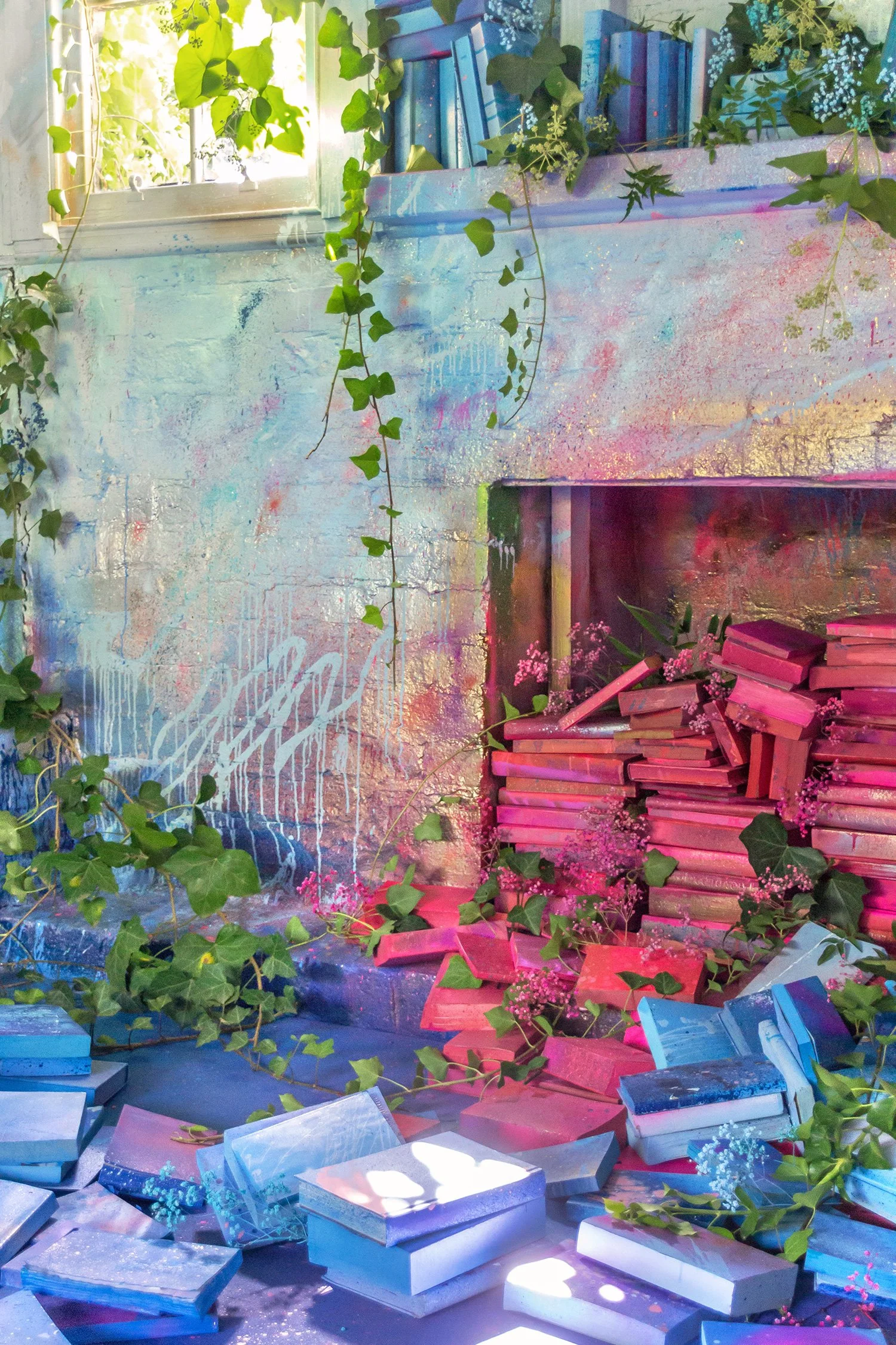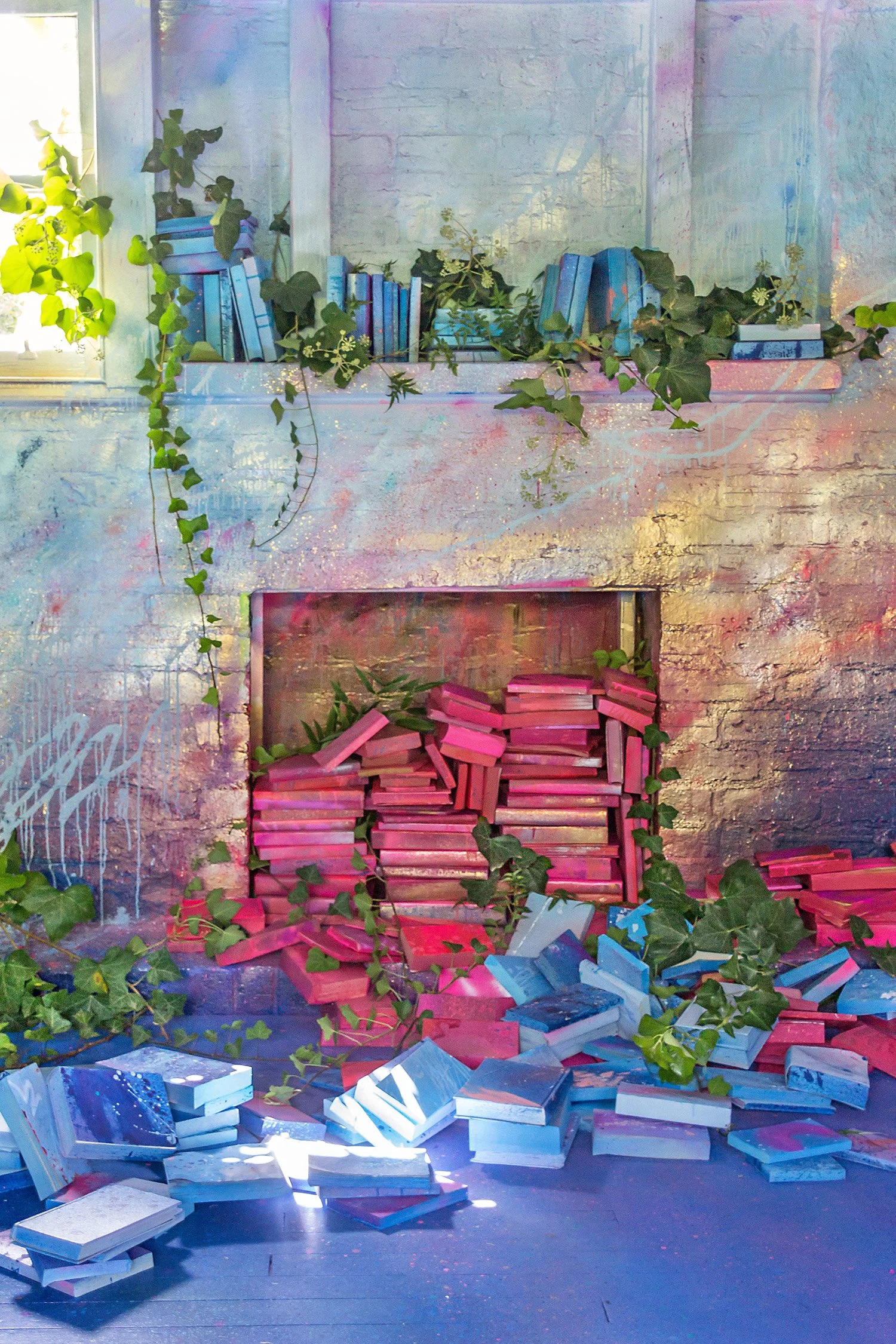 The Burning of Lies is an immersive installation that evolved out of the mural project, The End of Shame. Painted books mirroring the aesthetic world of the studio are styled around a fireplace to represent lies. Burning these books, or lies, creates the heat needed to melt the frozen atmosphere of shame. Truth, ultimately, becomes the means of cancelling the tariff of shame and catalyzes freedom from a life stuck within its walls.