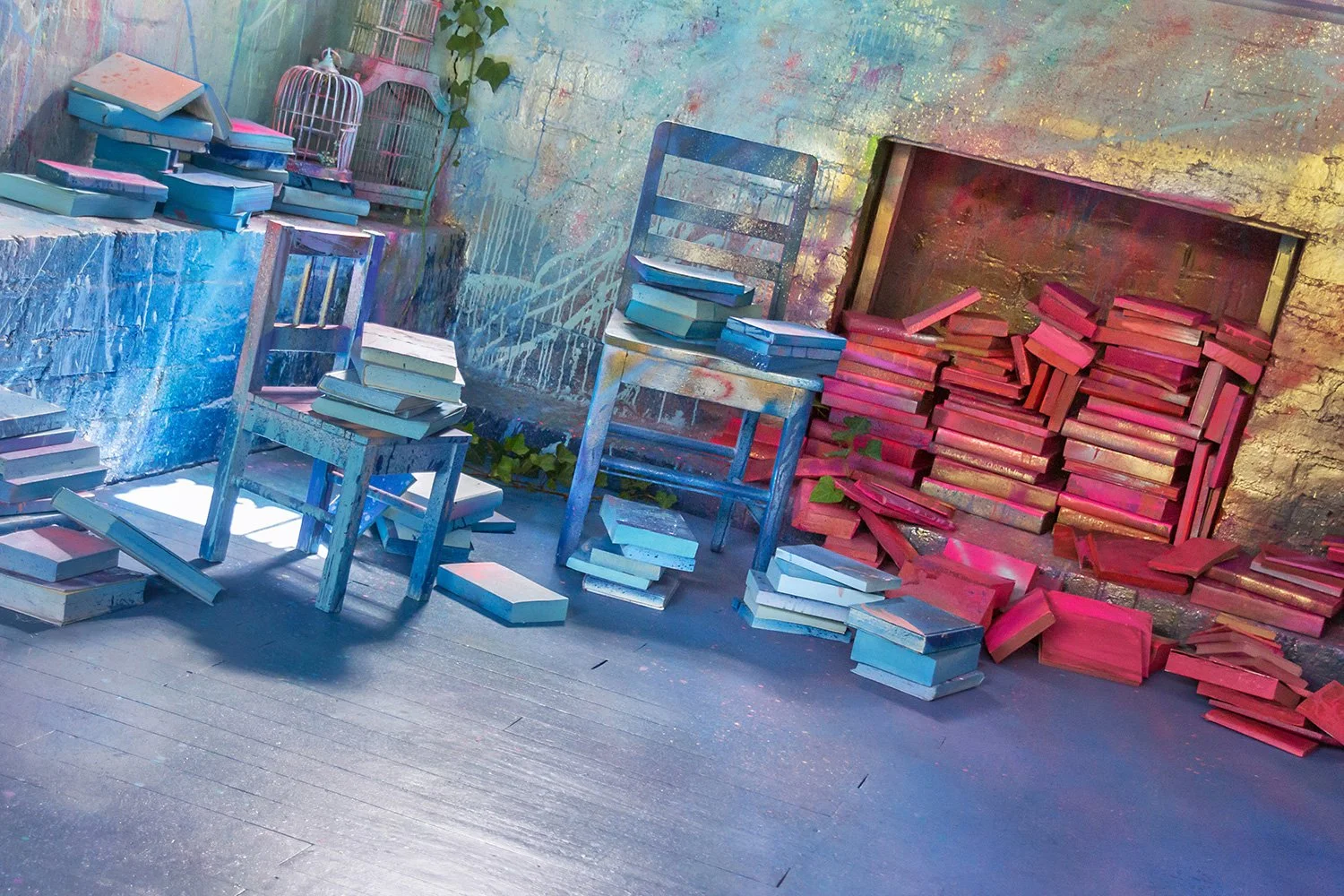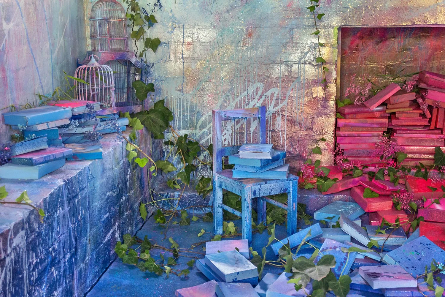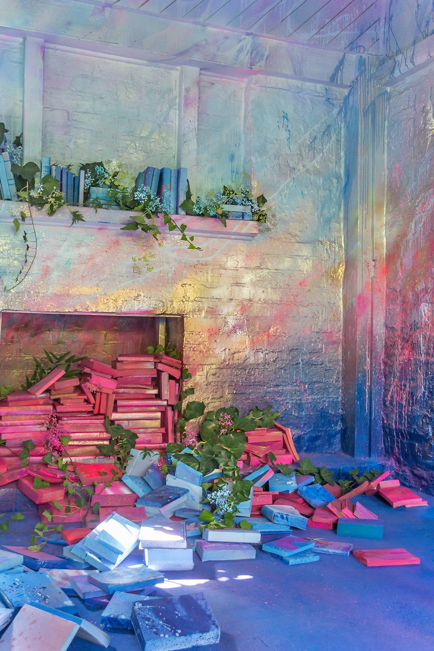 The Burning of Lies is an immersive installation that evolved out of the mural project, The End of Shame. Painted books mirroring the aesthetic world of the studio are styled around a fireplace to represent lies. Burning these books, or lies, creates the heat needed to melt the frozen atmosphere of shame. Truth, ultimately, becomes the means of cancelling the tariff of shame and catalyzes freedom from a life stuck within its walls.